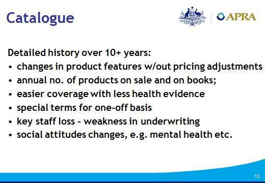 For example, detailed history over at least 10 years of “free” product changes; termination of policies as a results of premium increases; changes in underwriting standards; weaknesses in underwriting capabilities; and changes in social attitudes (e.g. to mental health, or to claim propensity, or to willingness to change suppliers) and other external forces that could have an impact on experience (e.g. epidemics). Note for reader: Attachment C has more detail.